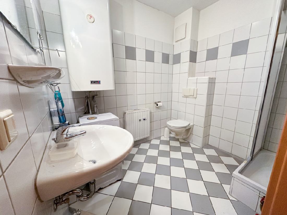 Das Badezimmer ist mit Dusche und WC ausgestattet.