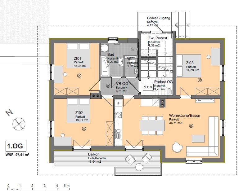 Diese Wohnung befindet sich im 1. Stock und verfügt über knapp 98m² Wohnraum mit riesigem Wohn-/Essbereich.