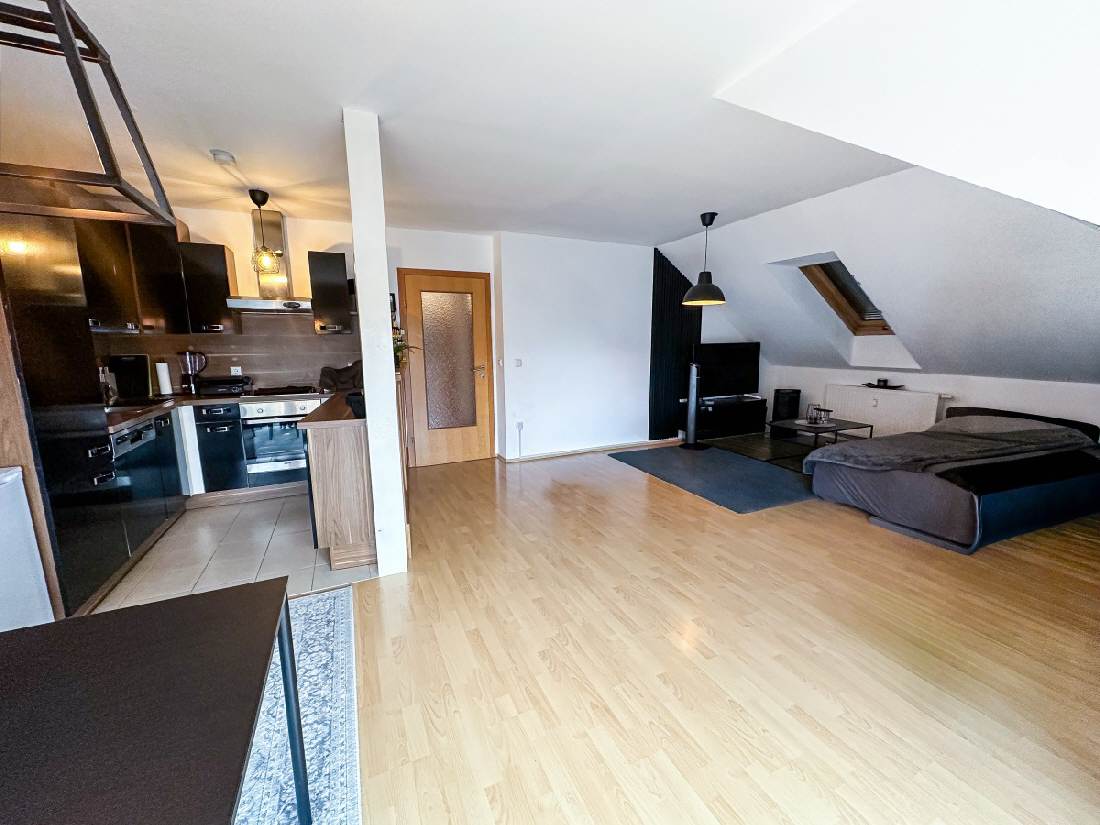 Der Wohnbereich besteht aus einer Küche mit angrenzendem Essbereich und einem geräumigen Wohnzimmer, das Ihnen viel Platz für Entspannung und gemütliches Beisammensein bietet.
